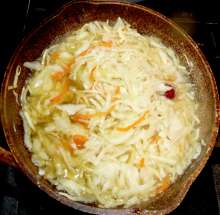 Длительность томления зависит от кислоты капусты – чем она кислее – тем дольше будет готовиться картофель.В оригинальном рецепте чеснок закладывается в самом начале, однако я не вижу в этом смысла – при длительном томлении аромат чеснока полностью исчезнет.