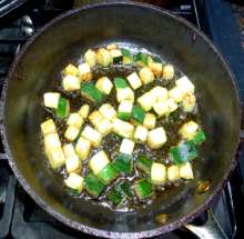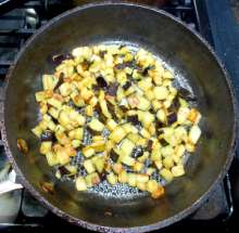Баклажан сполоснуть водой и отжать сок. Выложить в нагретую сковороду с растительным маслом.