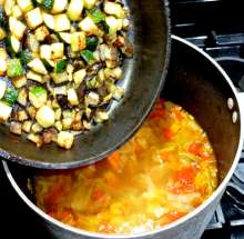 В оригинальном рецепте кабачек натирается на крупной тёрке и тушится вместе с остальными овощами, но он требует гораздо меньше времени для тушения, а при такой нарезке гарантированно растушится в желе, тогда как остальные овощи ещё не будут готовы.