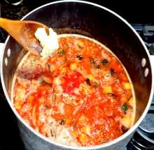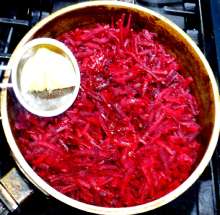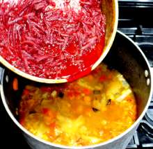 В оригинальном рецепте свекла тушится вместе с остальными овощами, но она требует гораздо больше времени для тушения, чем остальные овощи, и в результате либо свекла останется сырой, либо остальные овощи растушатся в кашу.