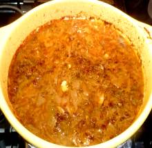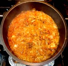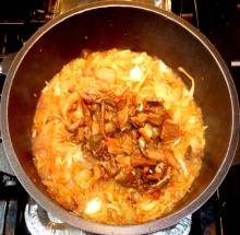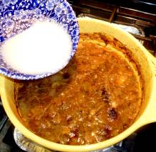 Если кастрюля не предназначена для духовки (как у меня) - перелить содержимое в керамический (чугунный) горшочек, долить кипятка до нужной консистенции.