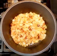 Поджарить лук до легкой корочки.