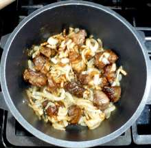 В оригинальном рецепте мясо жарится вместе с луком, но я предпочитаю обжаривать их отдельно - так надёжнее.