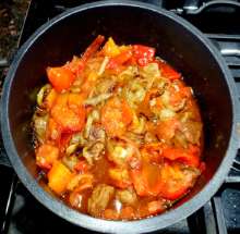 | Болгарский перец. | Крупные куски баранины обжариваются в казане на оливковом масле до золотистой корочки, затем тушатся почти до готовности. Затем к мясу добавляется лук, обжаренный вместе с чесноком, и обжаренный болгарский перец с помидорами. Блюдо тушится 20 минут и снимается с огня. |