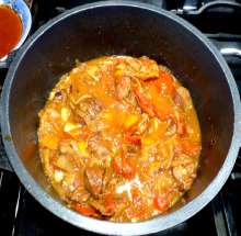 Долить кипятка так, чтобы жидкость покрывала мясо. Тушить на малом огне почти до готовности (около часа).