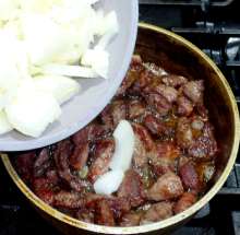 Затем убавить огонь до среднего, жарить, часто помешивая, чтобы мясо зарумянилось со всех сторон.