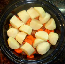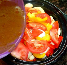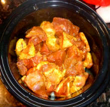 | Смесь специй в оливковом масле | Мясо маринуется несколько минут в оливковом масле со специями, затем долго томится в медленноварке вместе с овощами (лук, морковь, картофель, сладкий и острый перец, помидоры, чеснок) и маринадом. |