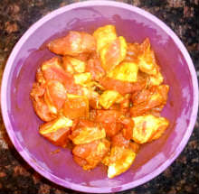 Выложить в миску нарезанное мясо, тщательно перемешать, чтобы каждый кусок был покрыт маринадом. Оставить мариноваться, пока режутся овощи.