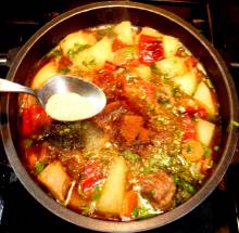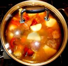 В оригинальном рецепте мясо тушится 20 минут вместе с поджаренными овощами и картофелем, но так можно готовить только хорошее мясо. Я же в свём мясе не уверен и думаю, что за 20 минут оно не приготвится, поэтому добавил дополнительное тушение.