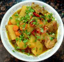 Сладкий перец, кинза, паприка, молотый кориандр, хмели сунели, бульон Поджаренные кусочки мяса выкладываются в толстостенную кастрюлю, заливаются бульоном, тушатся почти до готовности. Тем временем морковь, лук, болгарский перец обжариваются поотдельности, добавляются к мясу вместе с острым стручковым перцем. Следом добавляется картофель, ингредиенты перемешиваются, доливается бульон и жаркое тушится под крышкой до готовности картофеля. За 5 минут до готовности добавляется рубленная кинза, молотый кориандр, паприка, хмели сунели, соль. При подаче жаркое заправляется свежей зеленью.