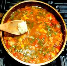 В оригинальном рецепте чеснок добавляется перед тушением. При всём уважении к сербам я не вижу в этом смысла – за час тушения вкус чеснока просто испарится.