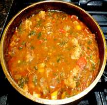 Смалец, сладкий перец, помидоры, чеснок, паприка. Кусочки мяса поджариваются в свином жире. В сотейник выкладывается лук, последовательно добавляются сладкий перец и помидоры. Зажарка заправляется паприкой, в сотейник возвращается мясо, ингредиенты заливаются бульоном и тушатся до готовности мяса. По готовности блюдо заправляется рубленной зеленью и чесноком. Подается с любым простым гарниром.