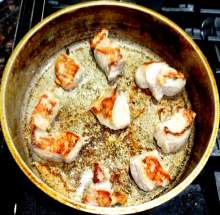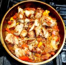 Кстати: В оригинальном рецепте мясо поджаривается в смальце (это венгерский вариант), но у меня его не было и я заменил его беконом. Допускается также обжарка на растительном масле.