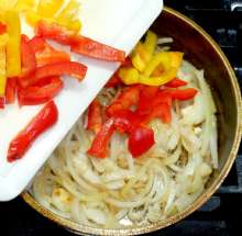 Когда лук станет прозрачным – добавить перец. Жарить несколько минут до мягкости.