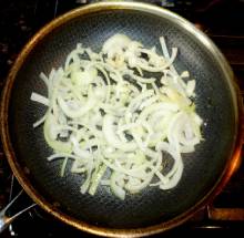 Долить растительного масла, выложить лук в сковороду. Поджарить лук до легкой корочки.