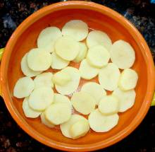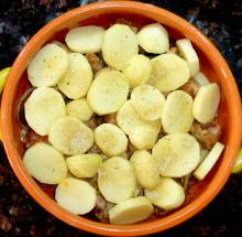 Мясо покрыть второй половиной картофеля, посолить, поперчить, посыпать специями.