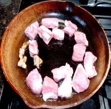 Выложить мясо в сковороду.