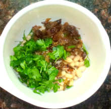 Петрушку порубить, все ингредиенты сложить в миску. Добавить четверть чашки жидкости из-под фасоли и 1-2 чайных ложки растительного масла (у меня - кунжутное).