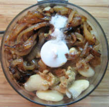 Выложить фасоль, жареный лук, чеснок в блендер, добавить соль, сахар, горчицу, подсолнечное и кунжутное масло.