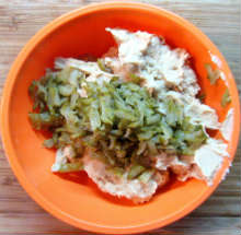 Выложить смолотые ингредиенты в чашку, добавить огурцы. Тщательно перемешать.