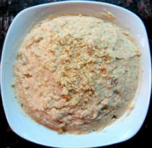 | Консервированная фасоль, чеснок, кунжутное масло, горчица, грецкие орехи. | Консервированная фасоль смешивается с жареным луком, чесноком, маслом, горчицей, солью и сахаром. Все ингредиенты перемалываются в блендере. Добавляется натертые соленые огурцы. При подаче паштет заправляется молотыми грецкими орехами. |