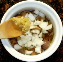 Подсолнечное масло, лук, чеснок | Солёные грибы смешиваются с сырым луком, рубленным чесноком и заправляются подсолнечным маслом и уксусом. |