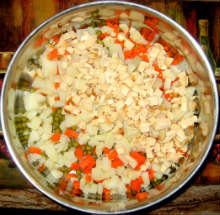 Жареная курица Морковь, картофель, яйца отвариваются. Все ингредиенты нарезаются мелкими кубиками, смешиваются, добавляется зеленый горошек, салат заправляется майонезом, перцем и тщательно перемешивается.