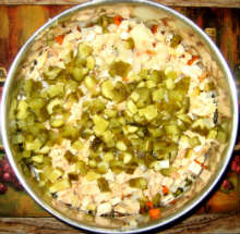 Традиционно Оливье готовят в тазике, а подают в хрустальной посуде. С фото тазика обычно проблем не возникает, а вот хрустальную посуду сфотографировать не удается - к тому времени обычно не до фоток. Так что у меня - оливье на следующий день (ещё вкуснее) а с хрустальной посудой и в сети проблема - на всех фотках какие-то суповые миски - тоже, видать, на следующее утро фотографировали.