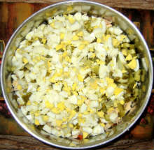 Добавить огурцы, яйца, перемешать.