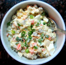 Традиционное украшение русского новогоднего стола. Мы помним его с детства, казалось, он был всегда, однако современный его вариант появился только в 60-е годы прошлого века. Как бы то ни было, а праздничный стол без оливье - не стол. Но актуален Оливье и после Новогодней ночи, учитывая десятидневные каникулы. У каждой хозяйки теперь свой рецепт этого салата. Есть он и в нашей семье. Основное отличие от традиционного рецепта - замена колбасяы жареной курицей. Эта замена кардинально меняет вкус салата, облагораживая его.