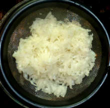 | Кунжутное масло, уксус, жареный лук | Натертый на средней терке и отжатый от сока дайкон смешивается с жареным луком и заправляется солью, перцем, зеленью, подсолнечным и кунжутным маслом, уксусом. |