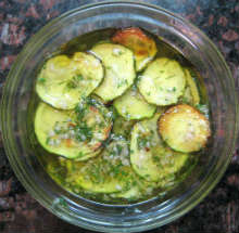 Запеченные кабачки | Нарезанные кружочками кабачки запекаютя в духовке, заливаются маринадом (уксус+подсолнечное масло+чеснок+укроп+соль и перец) и выдерживаются сутки. |