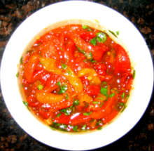 При добавлении перца к раскаленному маслу может быть много брызг, так как перец насыщен жидкостью, выделившейся в процессе запекания. Нужно иметь наготове крышку, а лучше - готовить на улице, если есть возможность.