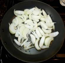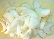 Обжарка лука оригинальным рецептом не предусматривается, но я не люблю печёный лук, поэтому включил его легкую обжарку перед запеканием.
