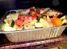 Оливковое масло, запеченный чеснок. | Примерно равные количеситва сезонных овощей, нарезанных довольно крупно, выкладываются в смазанную маслом форму для запекания, добавляется слегка поджаренный лук, разрезанные пополам головки чеснока, зелень (тимьян, розмарин - по желанию), соль, перец. Овощи поливаются оливковым маслом и запекаются 40 минут при 230 С. |